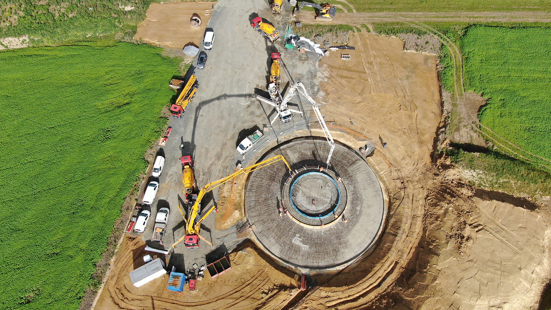 Blick auf die Baustelle Bürgerwindpark Flöthe am 7. Oktober 2021. Unsere Planung für einen Minimalverbrauch an landwirtschaftlicher Fläche trägt Früchte! Die für den Bau der vier Windenergieanlagen erforderlichen Flächen wurden so klein wie möglich gehalten.