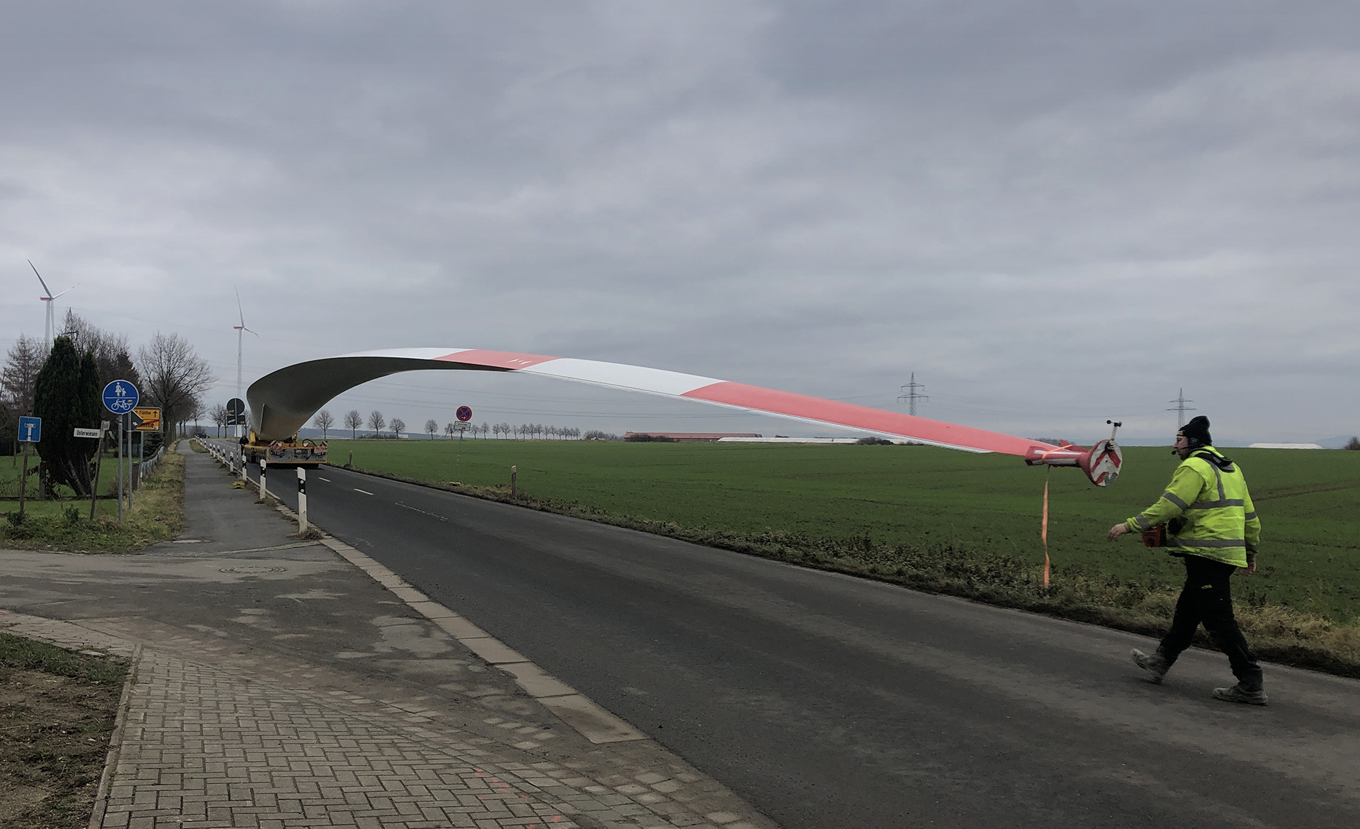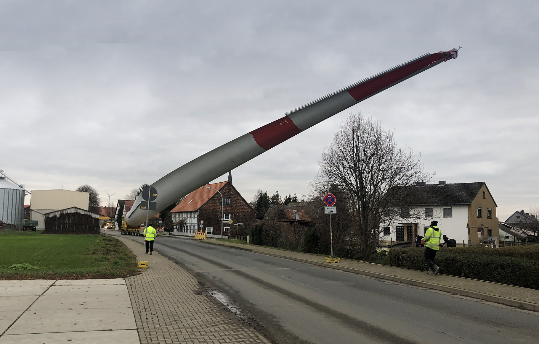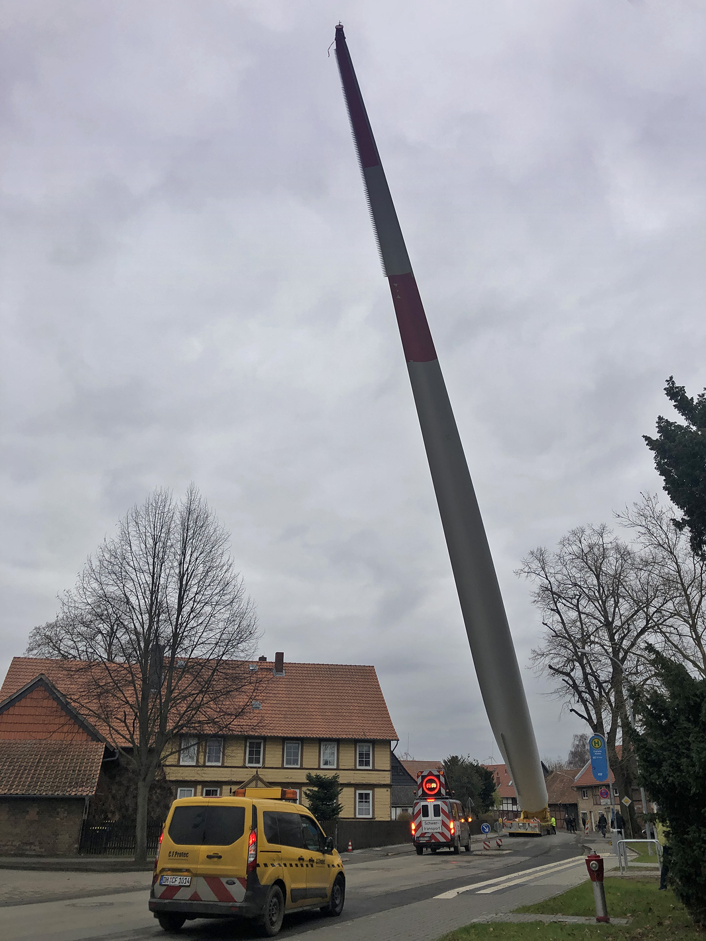 … zum Terrawatt Bürgerwindpark Flöthe. Das fünfte der knapp 80 Meter langen Rotorblätter wurde am 14. Dezember durch die engen Ortschaften zum Windpark manövriert. Das Team kennt nun die Vorgehensweise und kann den Transport eines Blattes in 30 Minuten entlang der 1,3 km langen Strecke und durch die teilweise schwierigen Abschnitte der Ortschaft Cramme sicherstellen. Insgesamt werden auf diese Weise 12 Rotorblätter für die 4 Anlagen bis Anfang Januar geliefert und vor Ort montiert.
